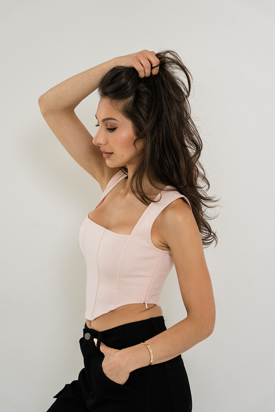 The Perfect Corset Top.Supported by thick shoulder straps, the front and back necklines are square. Bodice's Boned Panel Construction. Cropped V Hem Asymmetrically. At the side, a hidden zipper closure. The stretchy, supportive fabric.
